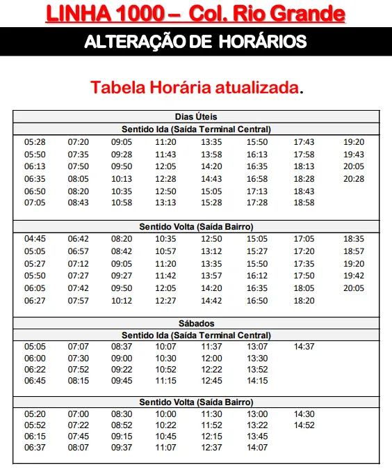 Com a criação da nova linha, a linha 1000 – Colônia Rio Grande teve ajustes nos horários a partir desta segunda-feira. As mudanças visam redistribuir a operação e otimizar o atendimento diante da nova oferta de viagens. Confira a tabela abaixo: