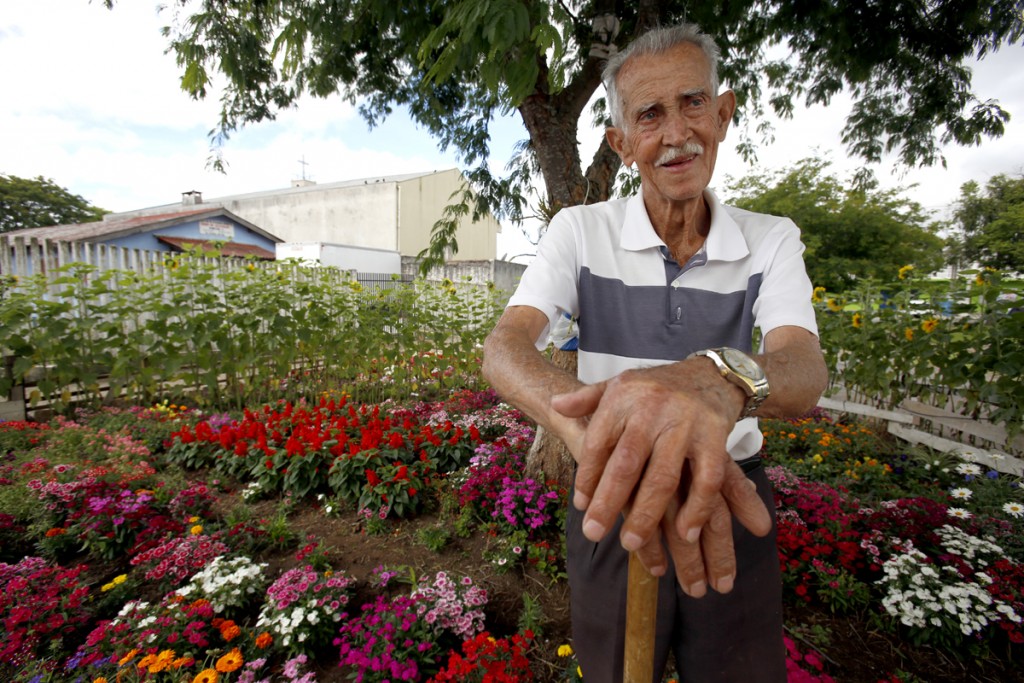O responsável por esse jardim é Seu Misael de Oliveira Braz. Aposentado há 17 anos, ele nasceu em um sítio na cidade de Joaquim Távora, município de 10 mil habitantes localizado no Norte Pioneiro Paranaense. Lá, cresceu ajudando seu pai a cultivar a terra, plantar e colher. “Trabalhei na lavoura dos meus pais até comprar minha própria chácara e começar a plantar feijão. Eu carregava sacos e sacos pra cima e pra baixo, e sempre gostei de trabalhar com a enxada”, recorda.