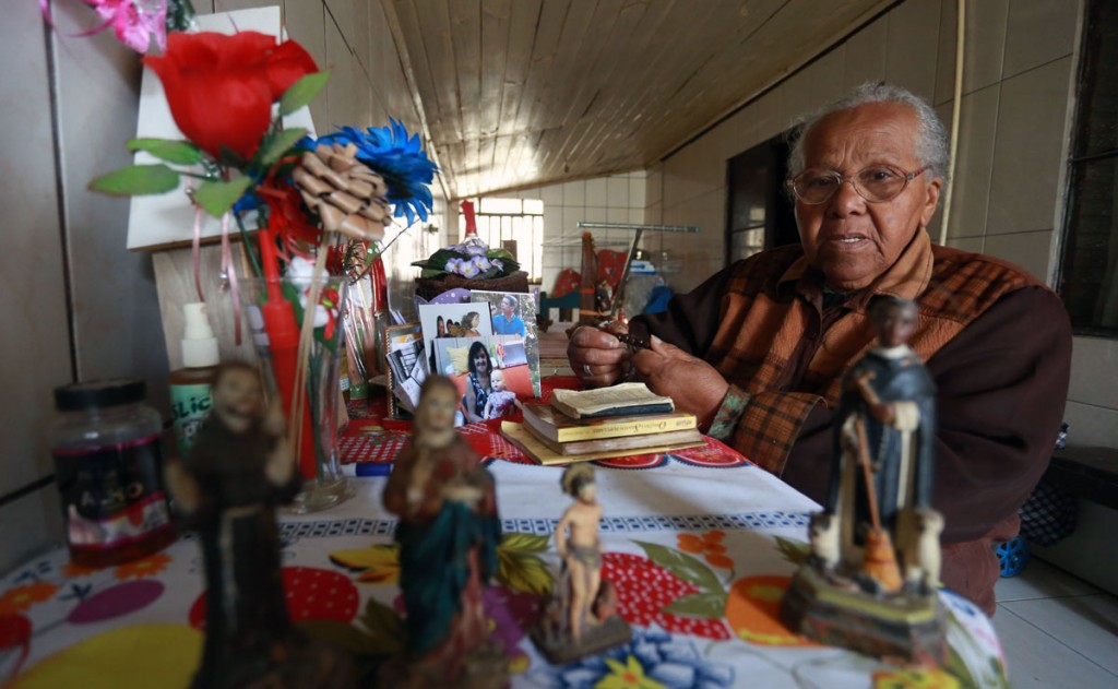 Entre as especialidades da rezadeira, a cura para a “doença de minguá” ou “doença do macaco” foi uma para as quais mais se dedicou. “Era mais comum antigamente. Os bebezinhos chegavam aqui magrinhos sem conseguir ganhar peso. Depois da bênção era só esperar e eles começavam a ficar mais gordinhos”, lembra. Grata pelo retorno de carinho que recebe dos pacientes, ela se orgulha em afirmar que seu trabalho é reconhecido pelo padre da paróquia que frequenta, também no bairro Cajuru. “Ele autoriza que eu benza como forma de ajudar as pessoas aqui da região. Não recebo nada em troca por isso, só quando alguém traz algum presente como agradecimento”, afirma apontando para uma máquina de costura sobre o móvel da sala.