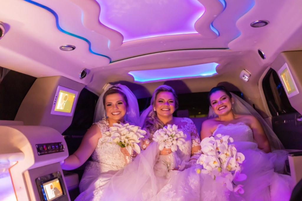 As irmãs Suelen Maria, Even Maria e Araceli Maria, as “três Marias”, como ficaram conhecidas, casaram no mesmo dia: 31 de agosto do ano passado. Unindo forças, conseguiram fazer um “festão” chique e bonito. E um dos “detalhes” mais chamativos do evento foi o aluguel de uma limousine branca, luxuosa ao extremo por dentro, para transportar os noivos. E elas resumem: valeu muito a pena, não só pelo “glamour”, mas pela comodidade de alugar um veículo que transportasse os três casais de uma só vez de forma memorável, conforme o estilo da festa que organizaram.
