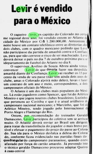 Em 1979, após o vice-campeonato paranaense, Levir Culpi foi negociado com o Atlante, do México. A despedida não foi em campo – antes do jogo contra o Confiança, pelo Campeonato Brasileiro, ele entrou no gramado da Vila Capanema para ser aplaudido pelos torcedores do Colorado.