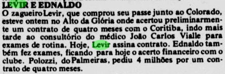 Já profissional do Coritiba, Levir Culpi sofreu nas mãos da imprensa. Não por críticas ou perseguições, mas porque não acertavam o nome dele. No recorte acima, ele já aparece entre os reservas do Coxa.