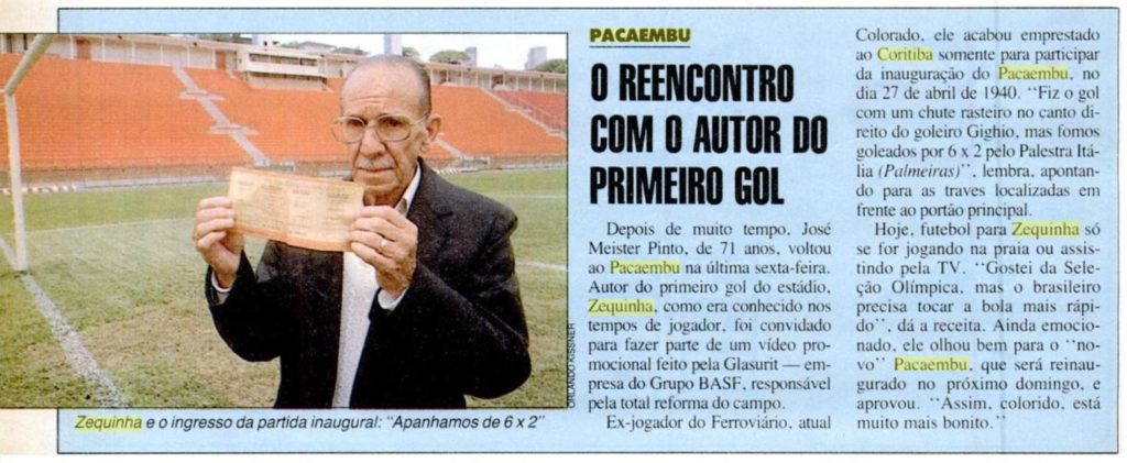 Na edição de 4 de novembro de 1988, Placar registrava a ida de Zequinha ao Pacaembu, dias antes da reinauguração do estádio. A marca de José Meister Pinto ficou para a história. Ele faleceu em 1991.
