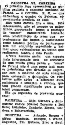 Na matéria acima, do dia 28 de abril, está a apresentação do jogo Palestra Itália x Coritiba. O time paulista contava com o goleiro Gijo, o half Junqueira e os ponteiros Luizinho e Echevarrieta. Segundo a Folha da Noite, os visitantes estavam “aptos a oferecer dura resistência e almejam a vitória”.