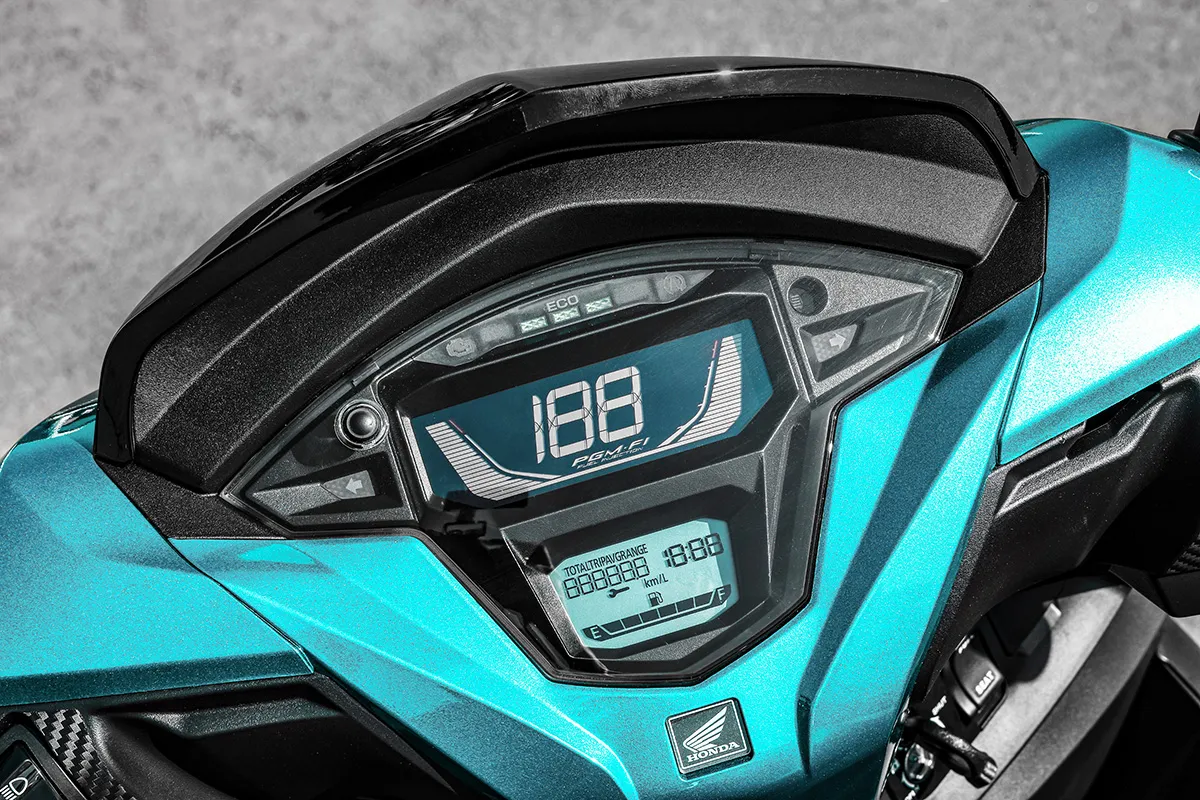 Outra importante evolução na Honda Elite 125 é o painel LCD Blackout, totalmente digital e agora mais amplo. Além dos dados tradicionais – velocímetro/hodômetro total e parcial e relógio – traz informações como consumo instantâneo, consumo médio, autonomia restante, indicador de bateria e o Eco Indicator, que monitora o modo de pilotagem visando maior economia de combustível. Outro equipamento inédito é a função “Pass” no comutador do farol baixo/alto, que permite lampejo de sinalização com o farol alto de modo prático e seguro.
