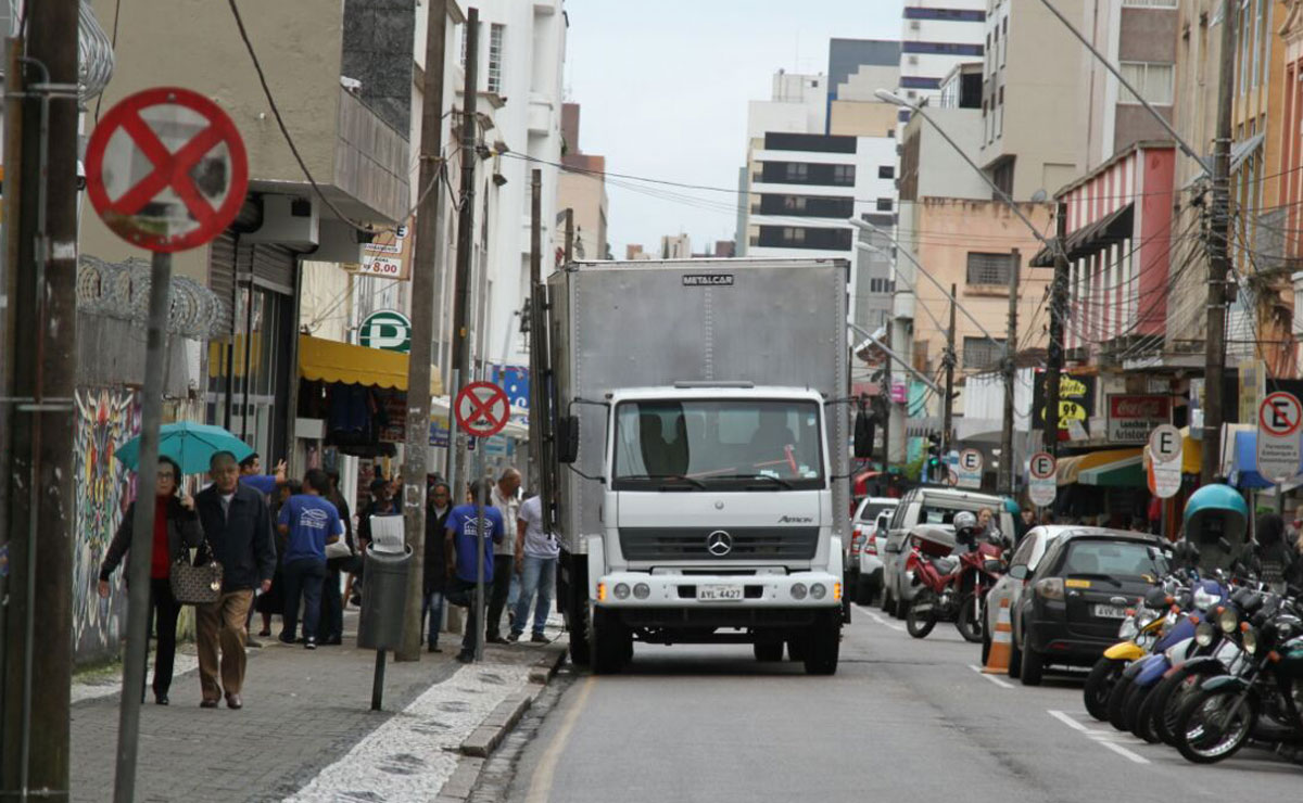Um caminhão com o emblema do governo do Paraná bloqueou a Rua Pedro Ivo, no Centro de Curitiba, na manhã desta quarta-feira (7). O detalhe é que o veículo estava na contramão, numa região onde vários motoristas já foram multados justamente por trafegarem no sentido proibido.