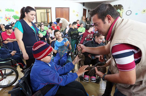 Os 52 alunos da Escola de Educação Especial Nabil Tacla receberam na manhã desta quinta-feira (09) uma “visita” inusitada: coelhos, chinchila, esquilo da Mongólia, calopsitas e uma jiboia foram levados até a escola, como parte de atividades de zooterapia promovidas pela Divisão de Educação para a Conservação da Fauna da Secretaria Municipal de Meio Ambiente. Os alunos puderam tocar e conhecer melhor os animais e assistiram a um divertido teatro de fantoches sobre o tráfico de animais silvestres.