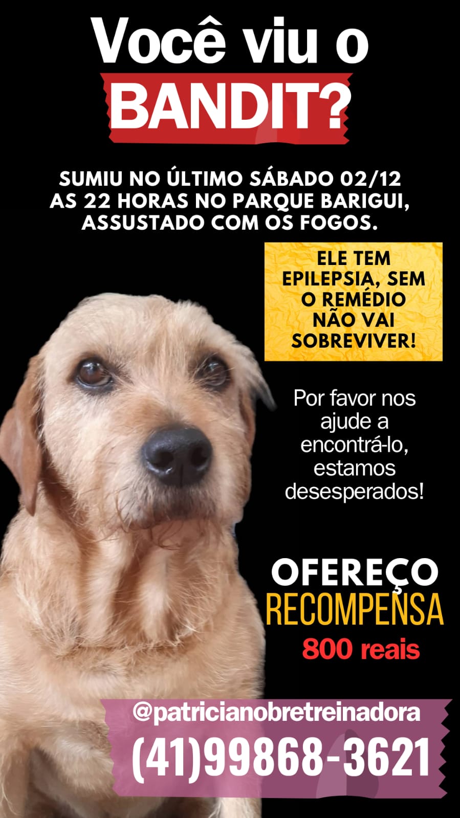 Patrícia Nobre oferece uma recompensa para quem ajudar a localizar o seu cachorrinho. Ele deve estar desorientado e pode apresentar alguns sinais de fraqueza. Qualquer informação pode ser comunicada pelo WhatsApp (41) 9 9868-3621.