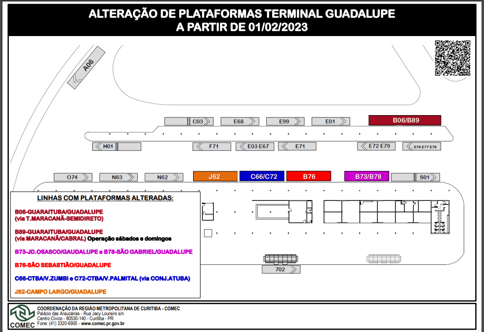 Com a inclusão da linha entre as plataformas de embarque do Guadalupe, foi necessária uma redistribuição das plataformas das linhas, B73 – JD.OSASCO/GUADALUPE, B76 – SÃO SEBASTIÃO/GUADALUPE, C66 – CTBA/V.ZUMBI e C72 – CTBA/V.PALMITAL. Confira abaixo o mapa com a indicação das novas plataformas.