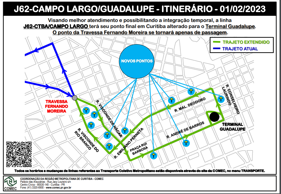 Já na volta, serão sete novas paradas, partindo do Terminal Guadalupe, acessando a Rua André de Barros, Rua Conselheiro Laurindo, Rua Mal. Deodoro e Rua Emiliano Perneta, para então seguir pelo itinerário atual.