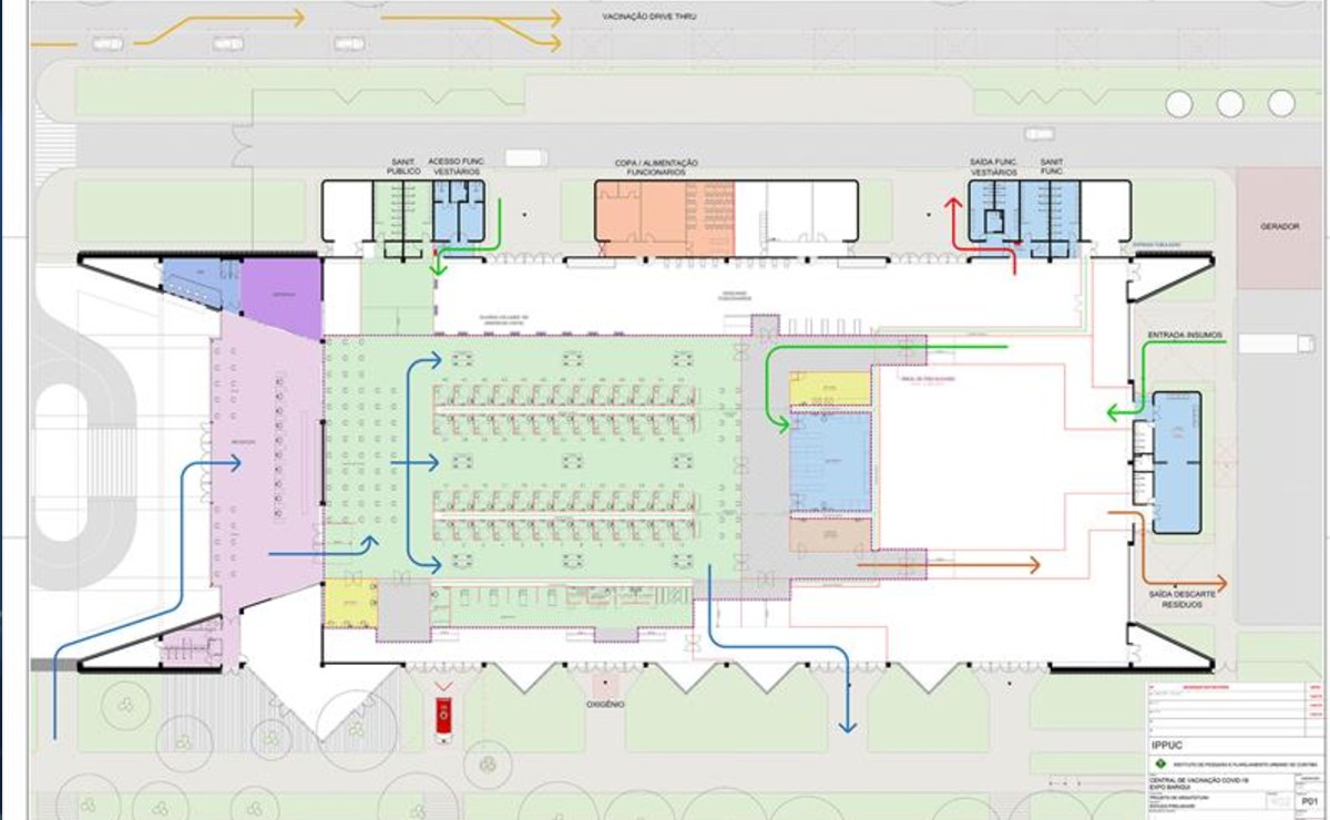 “O projeto segue as regras da Saúde e privilegia a segurança do público e dos profissionais encarregados da vacinação com vistas à efetividade no processo de imunização. O pavilhão conta com infraestrutura elétrica e hidráulica e de equipamentos, o que permite a rápida implantação e o boa dinâmica de funcionamento da central de vacinação”, explicou a diretora de Projetos do Ippuc, Célia Bim.