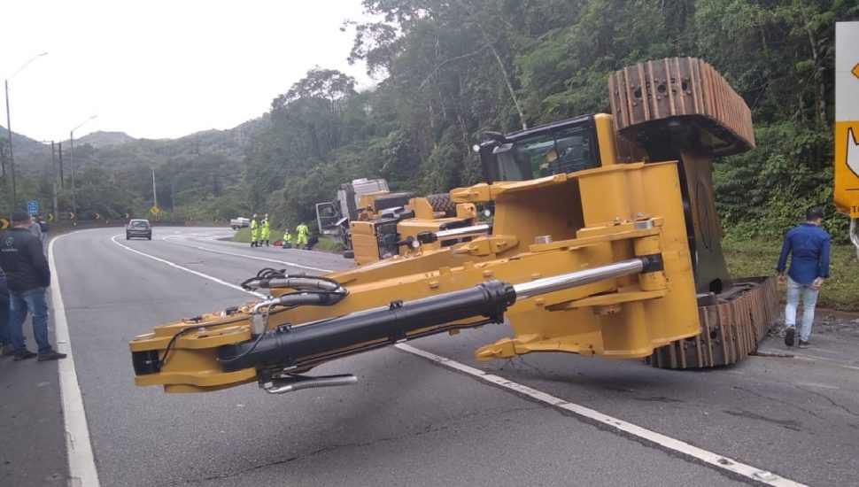 Segundo a Polícia Rodoviária Federal (PRF), a máquina caiu de um caminhão que a transportava. O acidente ocorreu por volta das 9h25. Ninguém se feriu.