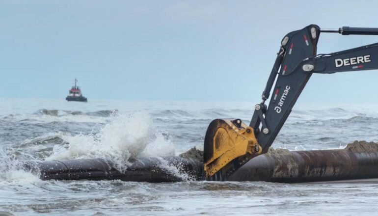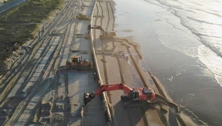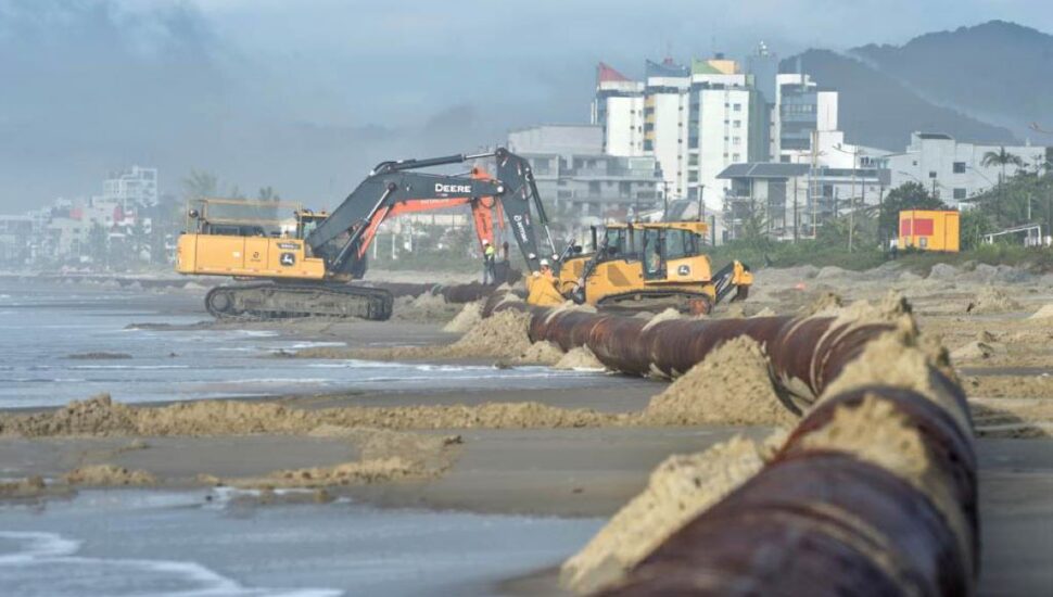 No total, serão 2,6 km de tubulação no trecho marítimo, que será acoplada à draga, e mais 1,8 km ao longo da orla para o espalhamento da areia na praia. A linha de tubos soldados foi posicionada flutuando, já pressurizada, e será posteriormente ancorada e afundada. Este processo, realizado por rebocadores na área marítima e equipamentos na parte terrestre, será realizado de acordo com condições climáticas.