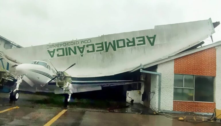 A forte chuva que atingiu Curitiba na tarde desta quarta-feira (18) alagou ruas, provocou quedas de árvores e também chegou a destruir parte da edificação do Hangar do Aeroclube do Bacacheri, na região Norte da capital.