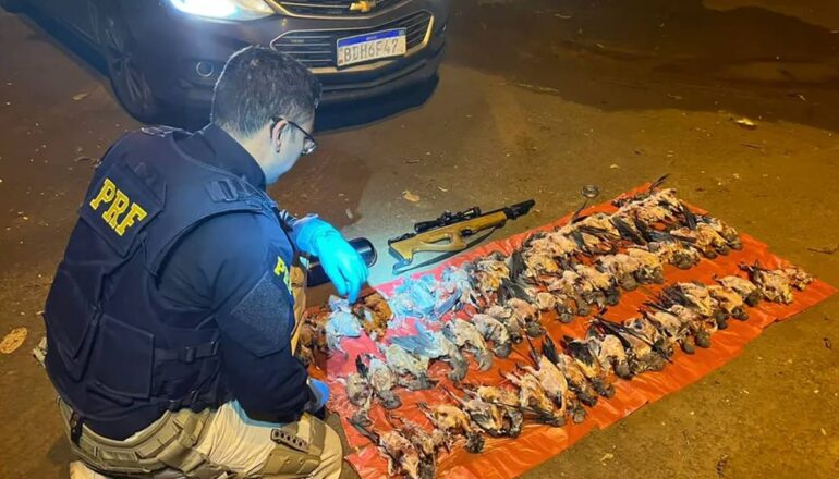 Um caçador foi preso em flagrante com 66 aves silvestres mortas. O homem, de 29 anos, foi abordado pela Polícia Rodoviária Federal (PFR) para um teste de bafômetro, que deu negativo. No carro, as equipes encontraram as aves abatidas e uma espingarda calibre 5,5.