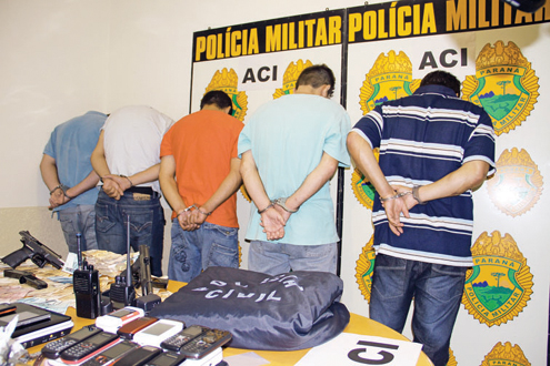 Cinco homens foram presos pela Polícia Militar, na tarde de sábado, suspeitos de envolvimento no assalto a uma casa, no Água Verde. Francisco Aurélio Bompani da Silva, 42 anos, Aguinaldo Gonçalves, 37, Alcione de Andrade, 45, Rodrigo Brisolara Rodrigues, 34, e José Carlos Hortis, 30, foram localizados em uma residência, na Rua Ivan Romeu Teixeira Júnior, no Pinheirinho. Com o bando, a polícia apreendeu R$ 54 mil, quatro carros, armas, drogas e aparelhos telefônicos.