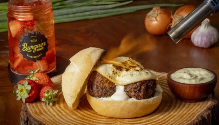 Bolinho de blend de carne bovina, creme de queijo, crisp de bacon, cebolinha, finalizado om sour cream, servido no pão. Acompanha fritas, pimenta caseira e maionese da casa. Drink: Esta Noite é Nossa – Caipirinha de limão siciliano e pimenta dedo de moça, Steinhaeger Doble W