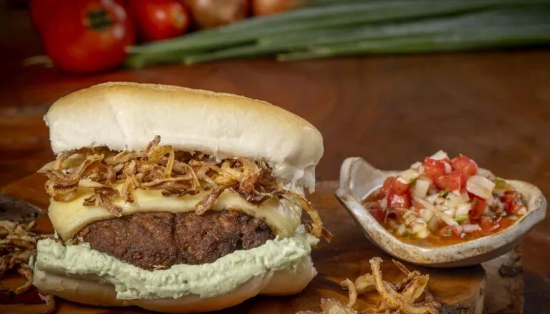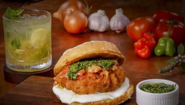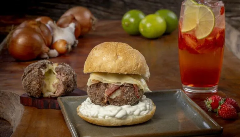 Bolinho de carne bovina recheado com queijo muçarela, tomate picante, molho chimichuri, maionese de alho, servido no pão crocante. DRINK: Caipirinha – Steinhaeger Doble W com limão taiti, xarope de mel e manjericão.
