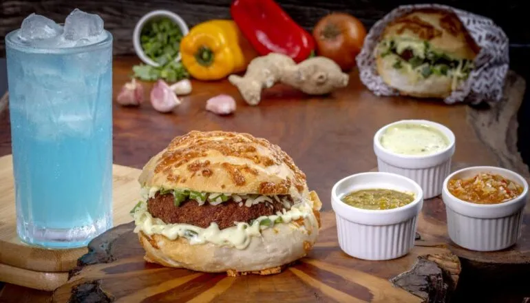 Bolinho de carne bovina e queijo parmesão, maionese artesanal verde de alho, agrião, servido no pão d’água. Acompanha vinagrete. Drink: limão siciliano, maracujá, Steinhaeger Honig Doble W (licor de mel) xarope de açúcar e gelo.