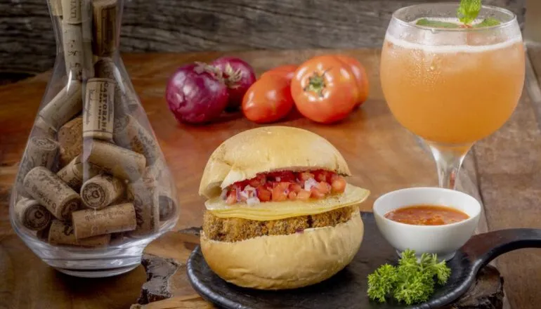 Bolinho de carne bovina, queijo muçarela, cebola crispy, maionese, molho chimichurri servido no pão fresco salgado. Drink: vinho tinto, frutas frescas, Licor Haeger Krauter Doble W (licor de ervas), refrigerante de limão e gelo.