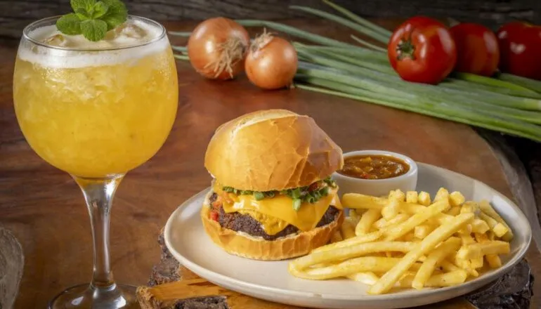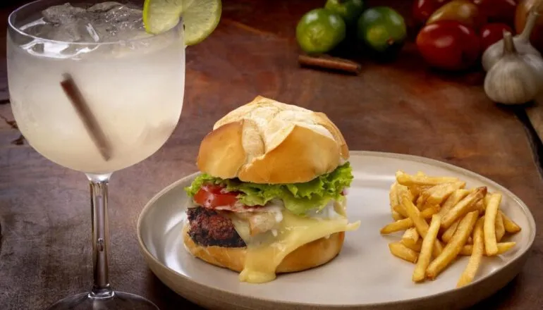 Bolinho bovino com temperos caseiros, bacon tostado, queijo derretido, maionese caseira de alho, alface e tomate, servido no pão cervejinha. Drink: Canela Citrus – Gin Doble W, refrigerante citrus, canela em pau e gelo.