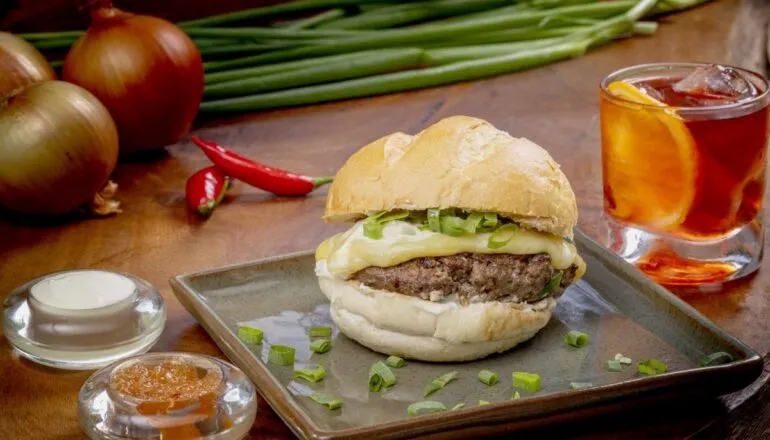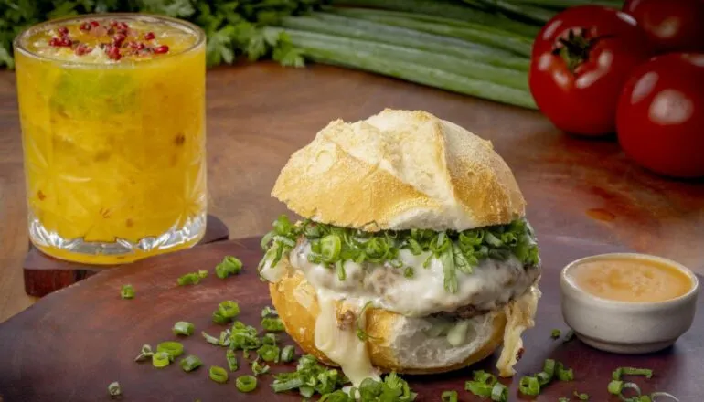 Bolinho de blend de carne bovina e bacon, queijo prato maçaricado, maionese verde da casa, cebolinha, servido no pão crocante. Acompanha vinagrete e mostarda dijon. Drink: Caipirinha Dois Amores – limão tahiti, limão siciliano, cachaça Schnaps Doble W, Steinhaeger Doble W, xarope de açúcar e gelo.