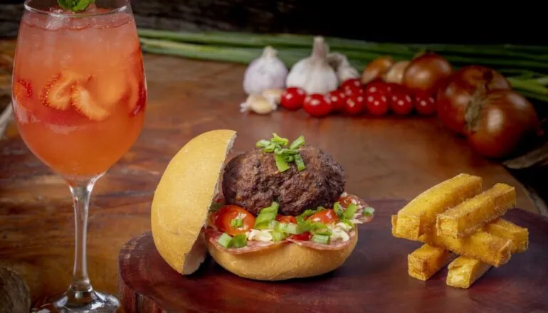 Bolinho de blend de carne bovina e bacon com pimenta biquinho, queijo provolone derretido, vinagrete, maionese de páprica defumada, servido no pão cervejinha. Drink: Beijos de Verão – suco de maracujá, morango, Steinhaeger Doble W, espumante Brut, xarope de açúcar e gelo.