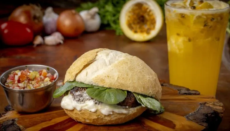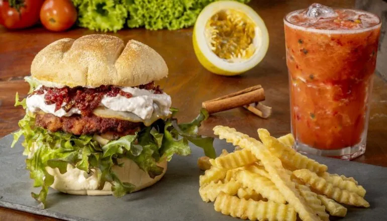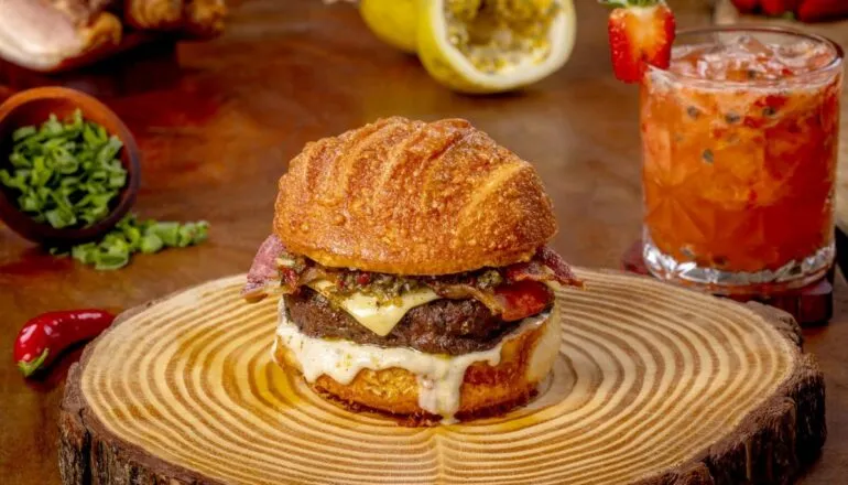 Bolinho de carne bovina, queijo provolone, maionese de bacon, alface, tomate, bacon em cubos, servido no pão cervejinha. Acompanha fritas. Drink: Dona Flor e Seus Dois Maridos – Steinhaeger Feur Doble W (licor de canela com pimenta), maracujá, morango, abacaxi, xarope de açúcar e gelo