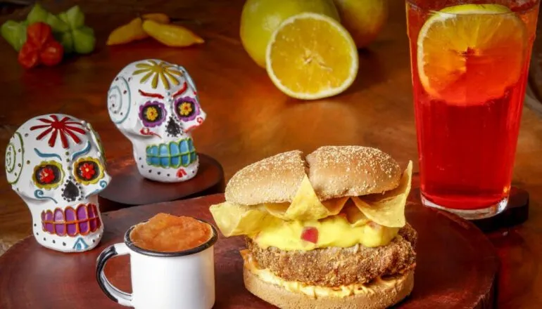 Bolinho de blend de costela bovina e bacon, muçarela, maionese da casa temperada, cheiro verde, servido no pão d’água. Acompanha molho de pimenta da casa. Drink: O Auto da Compadecida – manga, limão, Steinhaeger Honig Doble W (licor de mel), pimenta rosa, xarope de açúcar e gelo.