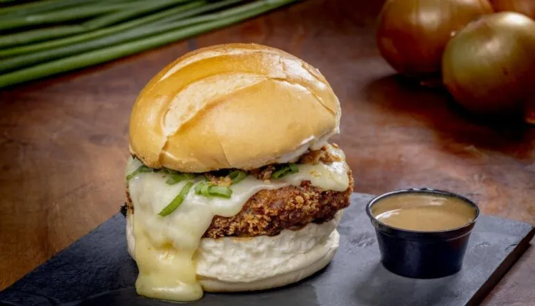 Bolinho de blend de carne suína e bovina empanado em farinha Panko, cebola crocante, queijo muçarela, maionese da casa, cebolinha, servido no pão crocante.