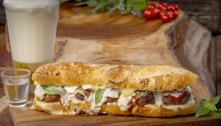 Bolinho de carne bovina, queijo muçarela, molho sugo, fonduta de gorgonzola, manjericão, servido no pão baguete. Drink: Barbarella – Submarinho (cerveja + shot de Steinhaeger Doble W).