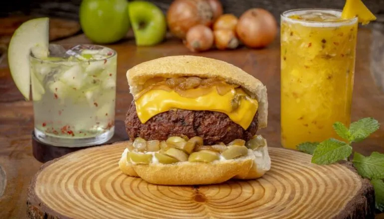 Bolinho de carne bovina, queijo cheddar, queijo golda, bacon, cebola caramelizada, servida no pão d’água. Acompanha batata Asterix, vinagrete, maionese de alho e geleia de maçã com pimenta. Drink: Apihito: limão taiti, maçã verde, hortelã, tônica de limão e sal, Vodka Doble W, rum de maçã verde, açúcar e gelo.