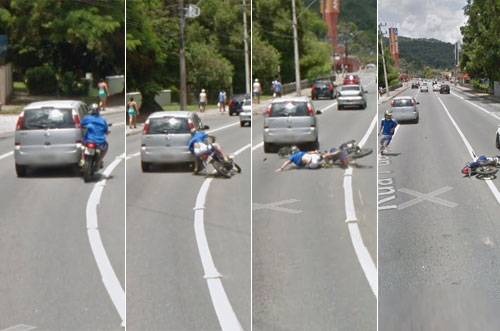 A sequência de imagens começa com o piloto que trafegava no meio das duas faixas da via. Em um determinado momento o motociclista perde o controle e atinge a lateral de um carro. Ele vai para o chão e desliza no asfalto, tudo foi flagrado pelo Google.