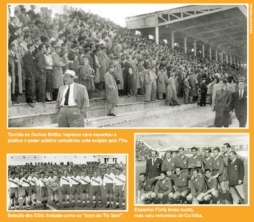 Domingo, 25 de junho de 1950, a manchete esportiva de O Dia regozijava: “Engalana-se o Colosso do Capanema”. Era a Copa do Mundo em Curitiba, com o jogo Espanha x Estados Unidos. Os portões do Durival Britto e Silva seriam abertos às 10h, embora o jogo começasse às 15h. Durante a semana, os jornais engrossaram o coro dos organizadores e convocaram o curitibano a bater recordes. A previsão, ou desejo, era renda de 500 mil cruzeiros. “As cadeiras cobertas num total de 1.700 estão voando. Cada qual de acordo com suas posses procura não perder de maneira alguma o espetáculo!”, dizia reportagem de o Diário da Tarde, dois dias antes. As cadeiras cobertas custavam 140 cruzeiros, de acordo com preço fixado pela Fifa e CBD – antecessora da CBF.