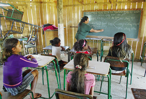 Apesar das dificuldades, foi encontrada uma maneira para incentivar o conhecimento do idioma nativo. A oca central da aldeia foi transformada em sala de aula. Mesmo parecendo improvisada, se tornou o espaço ideal para aprender ou reforçar o conhecimento do idioma. A oca, utilizada para rituais na manutenção das tradições indígenas, hoje abriga carteiras e um quadro negro.