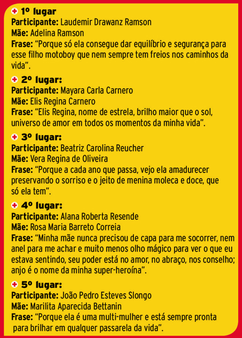 Nesta semana, encerrou-se o prazo para participar do concurso cultural Mês das Mães da Tribuna. Agora, o TDelas tem a honra de anunciar os cinco vencedores da promoção! Lembrando que a mãe do primeiro colocado, além de, assim como as mães dos demais escolhidos, ganhar diversos produtos de beleza e uma transformação visual completa, leva uma motocicleta para a casa! E, para quem não ganhou desta vez, vem mais promoções da Tribuna por aí! Fiquem de olho! Abaixo, vocês conferem os vencedores, os nomes das mães deles e as frases que deram a eles os prêmios da Tribuna, que respondiam à pergunta “Por que sua mãe é a melhor mãe do mundo?”: