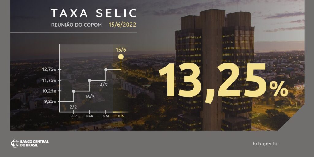 O Banco Central, através do COPOM, aumentou novamente a taxa Selic passando para 13,25%, maior valor desde janeiro de 2017.