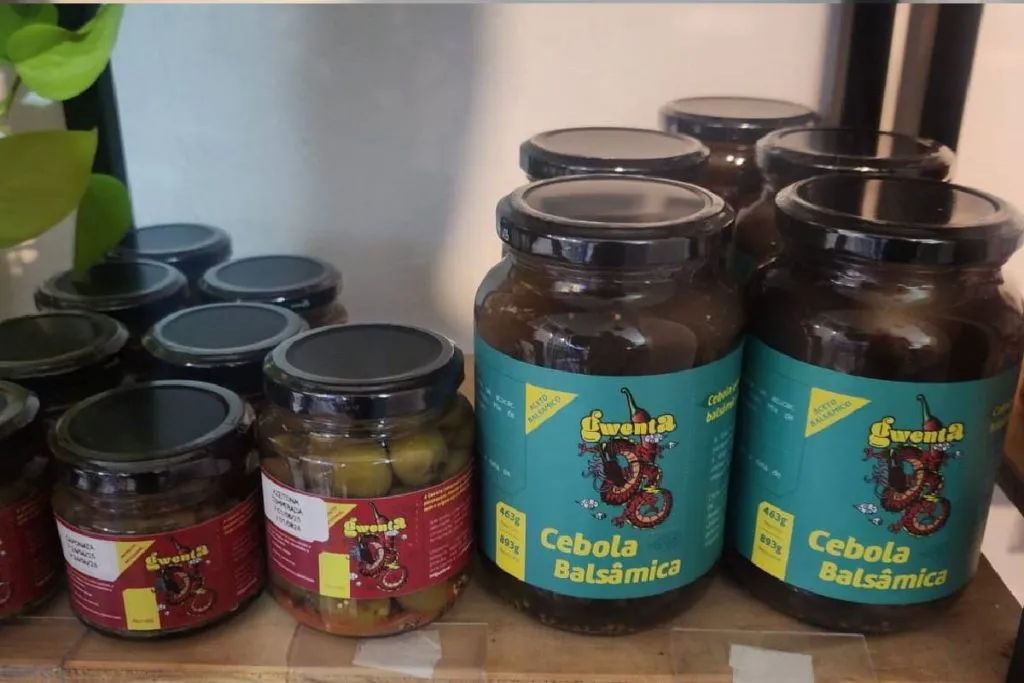 Em um dos cantos da Gwenta, os potes de conservas aparecem em diferentes versões que podem ser comprados. Tem a tradicional batatinha, perfeita para acompanhar com uma cervejinha, azeitonas, cebolinhas, cenouras, e o famoso escabeche de berinjela. São combinações simples, mas que falam muito sobre tradição, cuidado e sabor. Não Gwenta, tome leite!