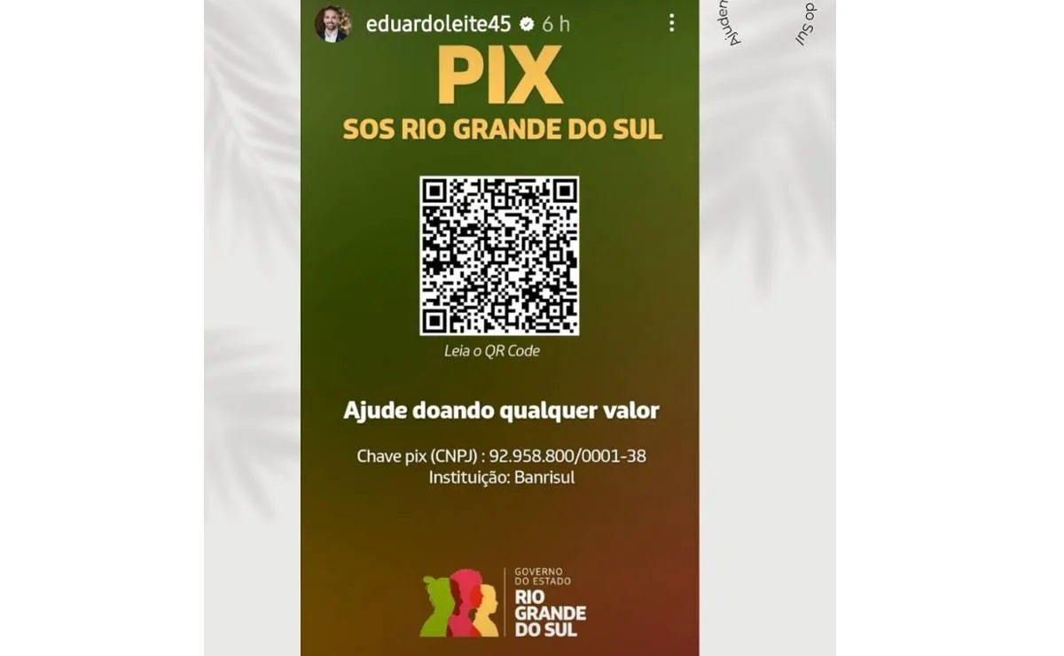 10) Faça o pix para o Rio Grande do Sul. SOS Rio Grande do Sul. Foi restabelecida a chave Pix (CNPJ: 92.958.800/0001-38)