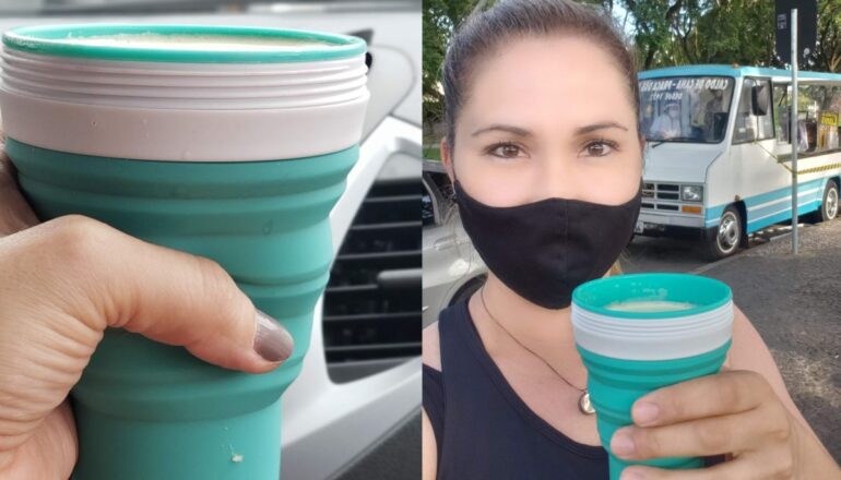 2 – Levar seu copo de uso permanente, evitando assim, o de uso único. Algumas festas já disponibilizam com o acessório para pendurar no pescoço. (Só pra matar a curiosidade de vocês, o meu é retrátil e levo sempre na bolsa. Olha ele aí embaixo).