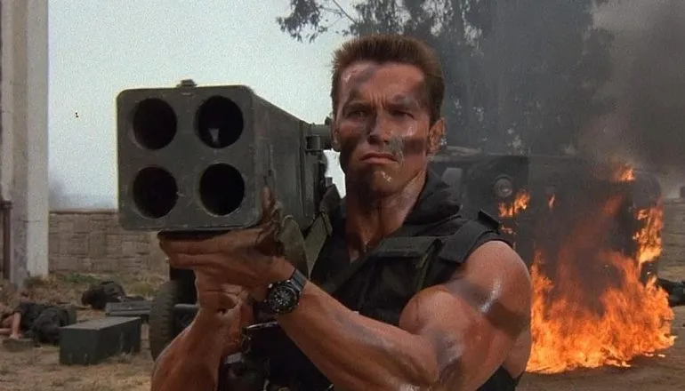 Comando para Matar (1985) – Ex-militar enfrenta seus inimigos para resgatar a filha pequena. Este filme é tão exagerado que hoje funciona como uma paródia do gênero. Schwarzenegger metralha tudo e todos sem sequer trocar a munição, enfrenta um vilão que é a cara do Freddie Mercury, imita o Rambo e solta frases de efeito a cada 5 minutos. Basicamente uma comédia. “Não incomode o meu amigo, ele está morto de cansado”.