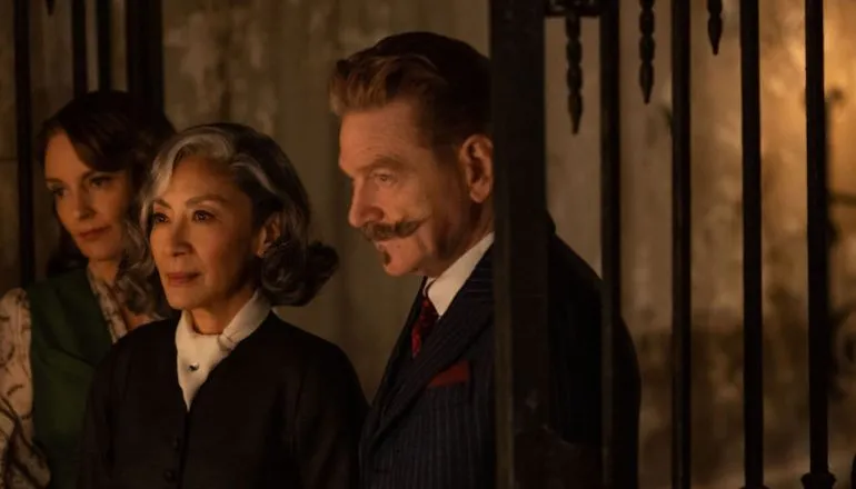 Este terceiro filme se beneficia de um escopo mais restrito, sem a megalomania de Expresso Oriente ou a artificialidade estética de Morte no Nilo, com uma trama que busca uma vibe mais sobrenatural na história da médium que é assassinada em um antigo palazzo em Veneza.