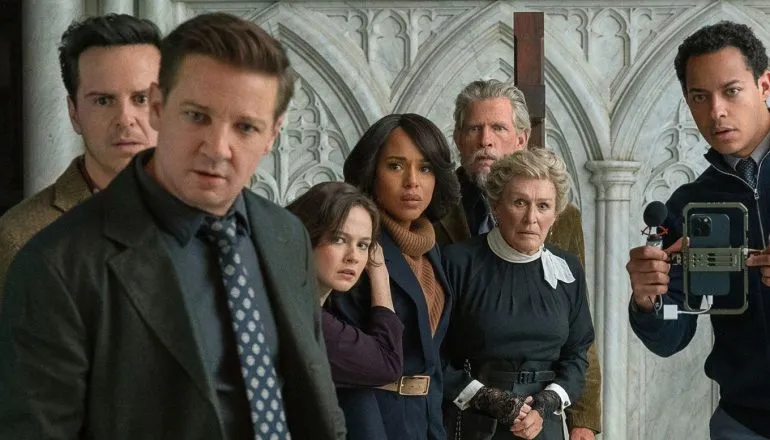 Ao redor desse conflito, Rian Johnson constrói um conjunto de personagens marcados por fissuras profundas. Glenn Close, Kerry Washington, Andrew Scott, Jeremy Renner, Thomas Haden Church e Cailee Spaeny formam esse pequeno rebanho, todos afetados pela presença sufocante do Monsenhor. Por trás de um conservadorismo local cuidadosamente encenado, o filme expõe problemas de paternidade mal resolvidos e relações familiares adoecidas, revelando uma moralidade sustentada muito mais pela aparência do que pela virtude.