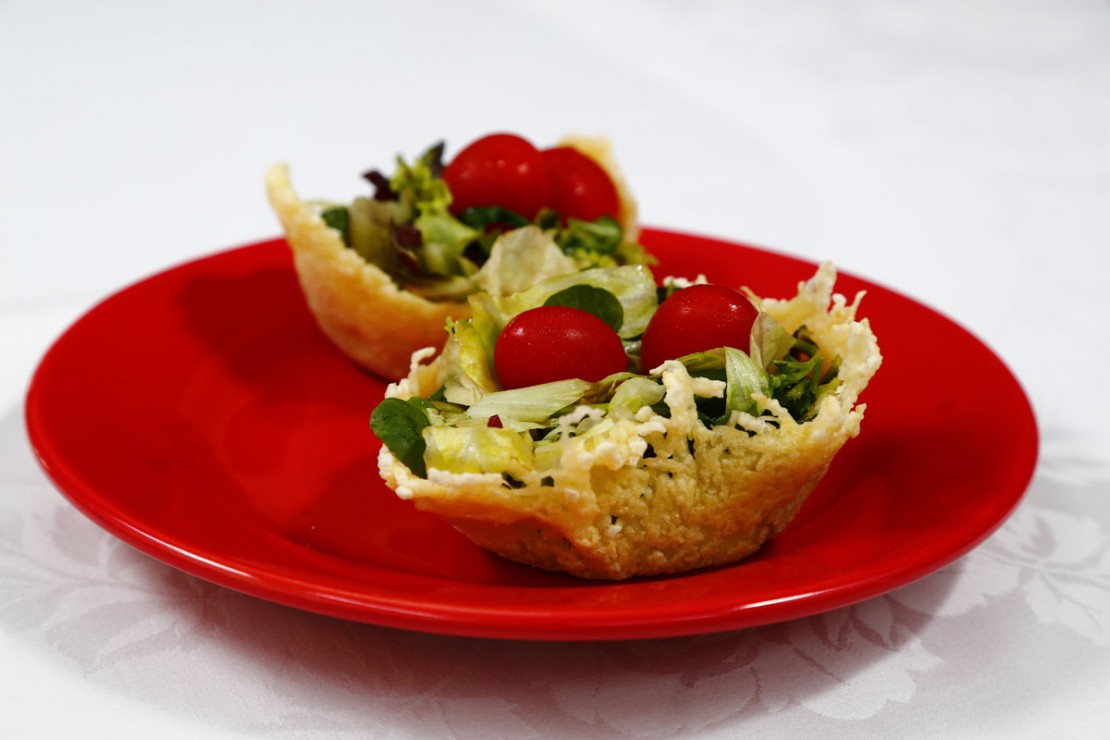 A ideia da receita da semana se baseia no fato de que além de sabor muito interessante de diferentes tipos de queijos misturados às hortaliças e frutas em uma salada, alguns tipos de queijo como o parmesão também se prestam para moldar “cestinhas” que podem conter as saladas e serem consumidas ao final incrementando o valor nutricional das saladas com proteína de alto valor biológico e cálcio de boa biodisponibilidade.