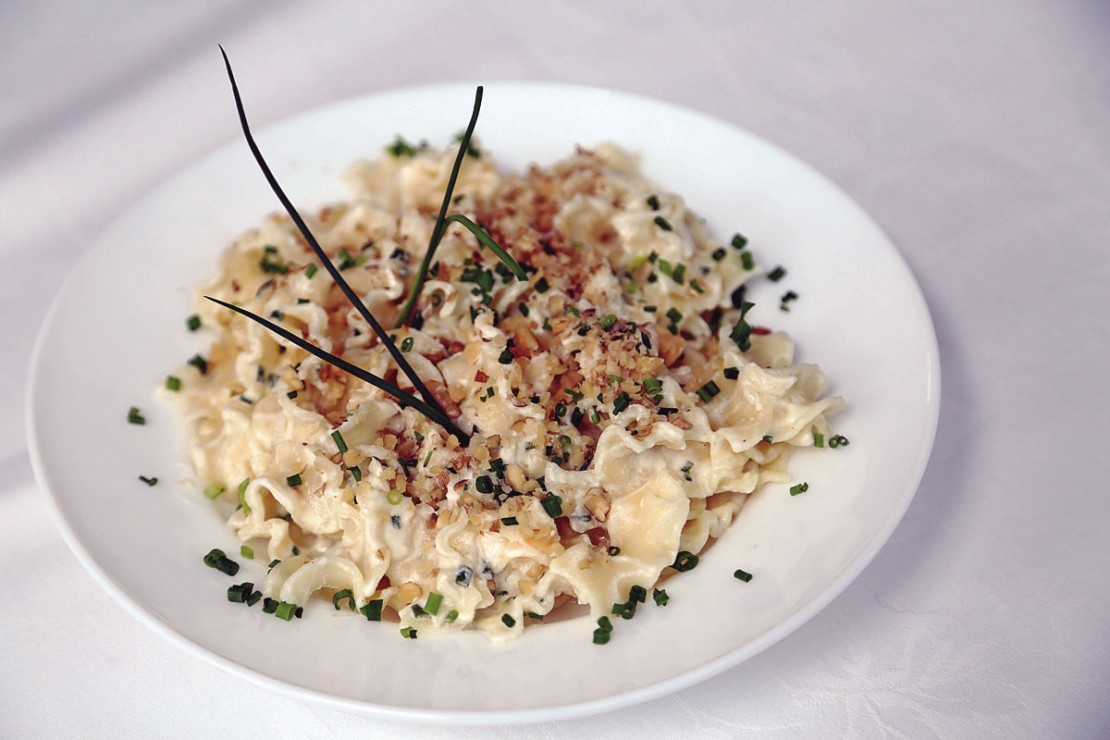 O verde pode vir de folhas do espinafre cozidas e cortadas finamente e misturadas ao queijo utilizado, o cottage ou quark, ou na proposta da receita onde o queijo foi temperado com alho finamente picado, dourado em azeite de oliva e adicionado de deliciosa cebolinha francesa picada.