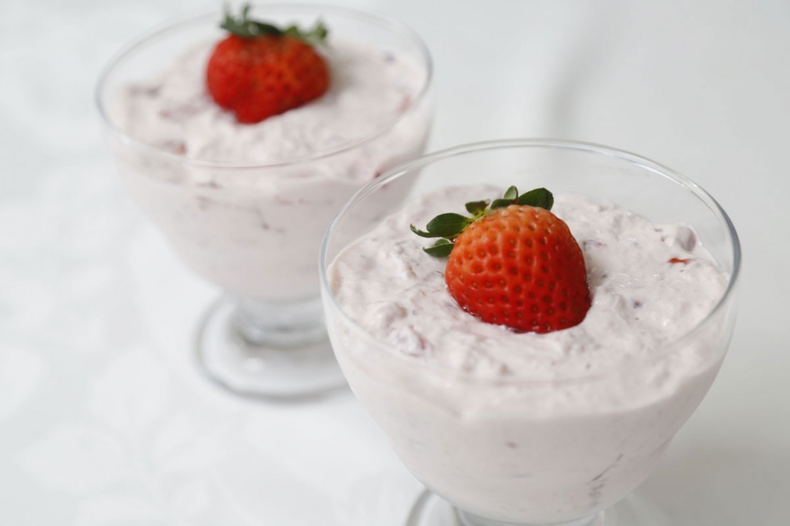 Passar para taças de sobremesa e enfeitar com morangos. Levar á geladeira por algumas horas até endurecer um pouco e servir gelado.