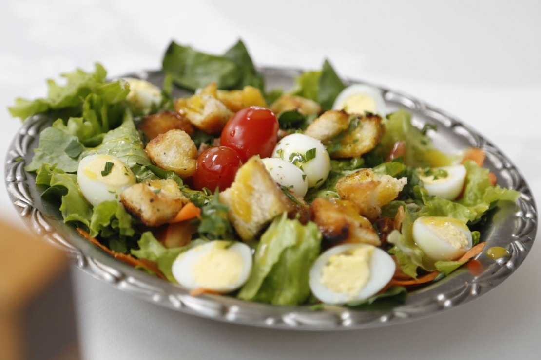 Finalizar a salada com os cubos de pão integral.