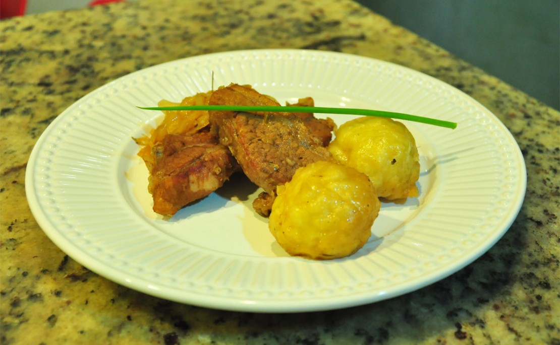 No prato – Coloque uma porção de Costela e linguiça no centro do Prato, em seguida coloque uma porção de repolho e finalize colocando dois Pãezinhos. Coloque uma folha de cebolinha para ornamentar.