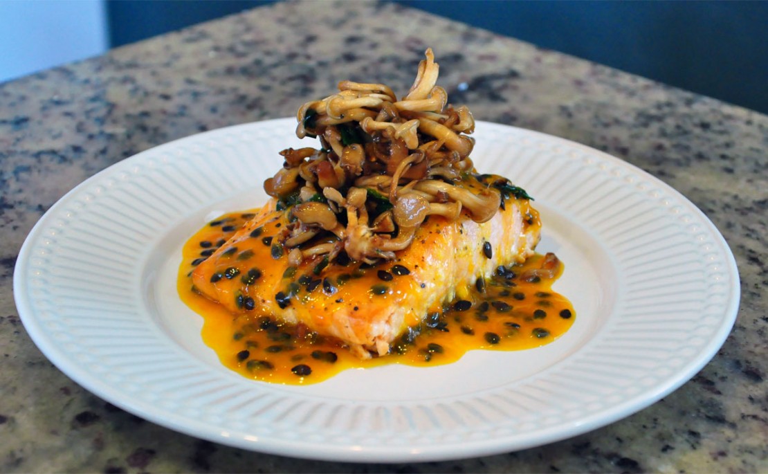 Em um prato raso de preferência de cor clara, coloque uma posta de Salmão ao centro, cubra com o Molho de Maracujá e acrescente os Cogumelos por cima.