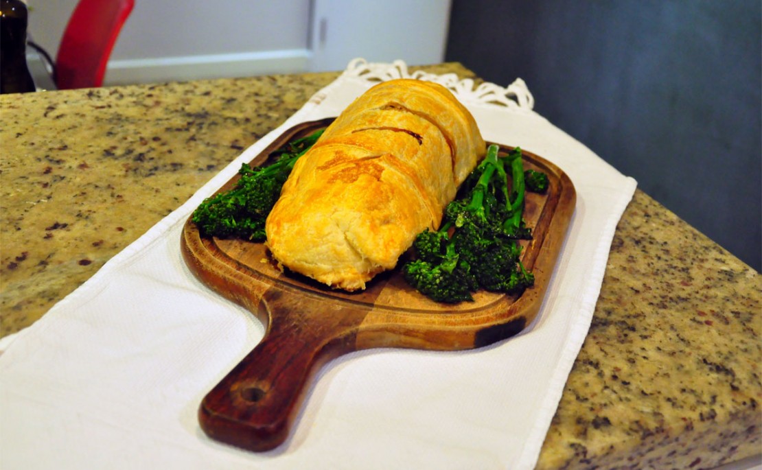 Nossa receita desta semana traz um clássico Inglês repleto de sabor: Filé Wellington com brócolis. Um filé mignon, coberto com mostarda de Dijon, patê de cogumelo, tiras de presunto Parma, enrolado em massa foleada e assado ao forno.